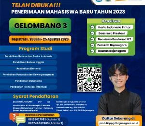 Humas IKIP PGRI Bojonegoro – Penerimaan Mahasiswa Baru gelombang tiga masih buka untuk calon mahasiswa baru. Masih tersedia pula jalur beasiswa prestasi. Jalur beasiswa prestasi ini menjadi favorit calon mahasiswa baru. Untuk informasi lebih lanjut dapat menghubungi admin (08155027992).