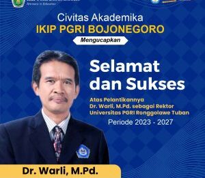 Humas IKIP PGRI Bojonegoro – Civitas Akademika IKIP PGRI Bojonegoro mengucapkan selamat dan sukses atas pelantikan Dr. Warli, M.Pd. sebagai Rektor Universitas PGRI Ronggolawe Tuban.