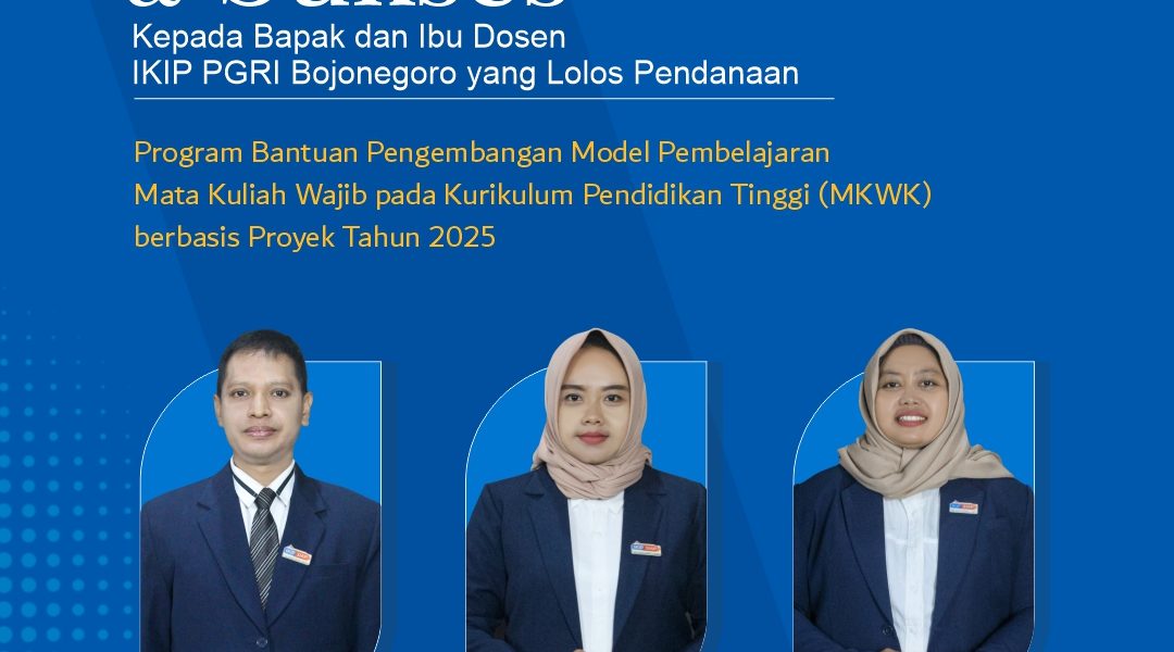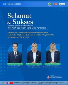 Humas IKIP PGRI Bojonegoro – Tiga dosen dari IKIP PGRI Bojonegoro berhasil lolos dalam Program Bantuan Pengembangan Model Pembelajaran Mata Kuliah Wajib Kurikulum Pendidikan Tinggi (MKWK) Berbasis Proyek Tahun 2025 yang diselenggarakan oleh Direktorat Jenderal Pendidikan Tinggi, Riset, dan Teknologi.