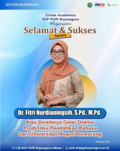 Humas IKIP PGRI Bojonegoro – Civitas Academika IKIP PGRI Bojonegoro kembali menorehkan kebanggaan. Salah satu dosen terbaiknya, Fitri Nurdianingsih, resmi meraih gelar Doktor (Dr.) pada Program Studi Ilmu Pendidikan Bahasa dari Universitas Negeri Semarang.