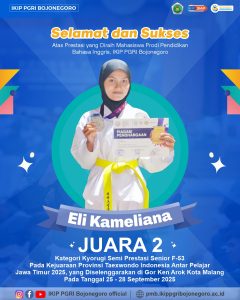 Humas IKIP PGRI Bojonegoro – Humas IKIP PGRI Bojonegoro – Civitas Academica IKIP PGRI Bojonegoro mengucapkan selamat dan sukses atas prestasi yang diraih Eli Kameliana Program Studi Pendidikan Bahasa Inggris IKIP PGRI Bojonegoro Juara 2 Kategori Kyorugi Senior Putri Semi Prestasi Senior U-53 Kg dalam KEJURPROV Taekwondo Indonesia Antar Pelajar Jawa Timur 2025, yang diselenggarakan di Gor Ken Arok Kota Malang 25-28 September 2025.