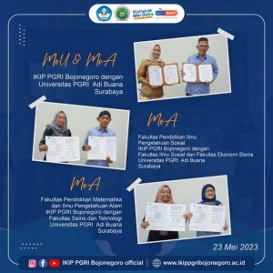 Rombongan IKIP PGRI Bojonegoro yang diwakili Dr. Ima Isnaini Taufiqur Rohmah, M.Pd. Wakil Rektor I IKIP PGR Bojonegoro, dan Dekan Fakultas Pendidikan Ilmu Pengetahuan Sosial Dr. Fruri Stevani, M.Pd., serta Dekan Fakultas Ilmu Pengetahuan Alam Dwi Erna Novianti, M.Pd., mewakili penandatanganan MoU & MoA dengan Universitas PGRI Adi Buana Surabaya. Bentuk kerja sama ini adalah kolaborasi berbagai program Perguruan Tinggi serta peningkatan sumber daya Dosen.