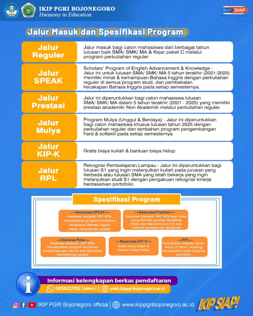 IKIP PGRI Bojonegoro memiliki tujuh jalur masuk yang terbagi menjadi dua yaitu reguler dan beasiswa.